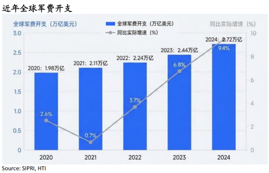 全球军费开销已进入快速增长通谈,2024 年全球军费开销达 2.7 万亿好意思元,同比增长 9.4%,创下 1988 年以来最大增幅。全球主要经济体均大幅提高军费预算,强化国防才气建设: