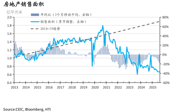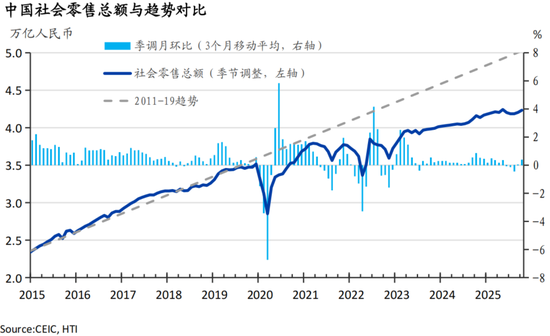 贸易战以来,中国经济展现出巨大的韧性,但经济增长动能有所弱化,罕见是内需动能偏弱,中国社会零卖总数不竭逾期于 2011-2019 年的增长趋势,且差距不竭扩大。现时,制约内需的核心成分正在出现边缘改善。