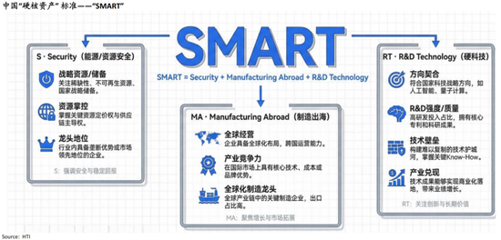 在国际规律重构的期间布景下,咱们提议中国 “硬核钞票” 的“SMART” 框架,涵盖 Security(能源 / 资源安全)、Manufacturing Abroad(制造出海)、R&D Technology(硬科技)三大维度,具体来看: