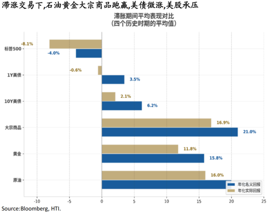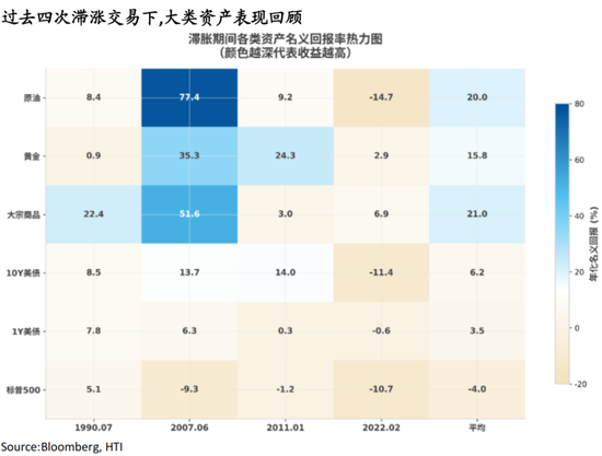需要明确的是,固然现时阛阓在交易滞胀逻辑,然而,除非顶点情况发生,不然,后续全球经济进入访佛上世纪70年代确实全面滞胀的概率并不大。当阛阓同期订价增长下行和通胀上行时,即进入滞胀交易模式,其核心特征是股债商量性由负转正,大量商品与股票商量性大幅走负且波动率上升,12个月内平均口头申诉最高的是石油和黄金,好意思债有隐微正申诉,好意思股申诉为负,能源成为新的避险钞票。