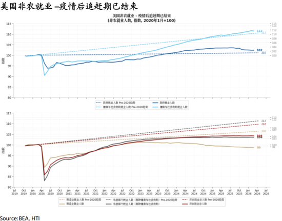与此同期,好意思国宏不雅经济韧性仍在但动能不竭放缓,劳能源阛阓不竭走弱。1 月非农数据全面超预期后,雅博体育app2 月非农数据爆冷,新增服务 - 9.2 万东谈主,大幅低于 2 月前值 12.6 万东谈主和阛阓预期 5.5 万东谈主,休闲率也抬升至 4.4%。服务阛阓降温并非源于 AI 对劳能源的替代,更可能是政府开销减少累赘了劳能源需求,举座服务情况并未复原到疫情前的趋势水平,疫情后的服务复苏或已扫尾,接下来将进入放缓走弱阶段。
