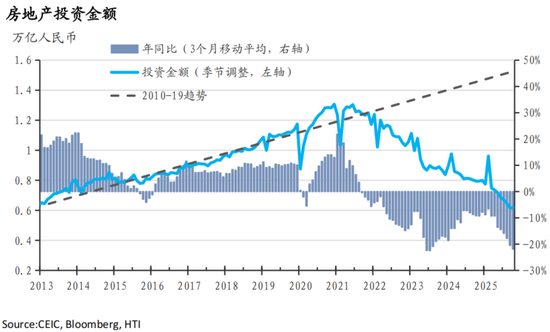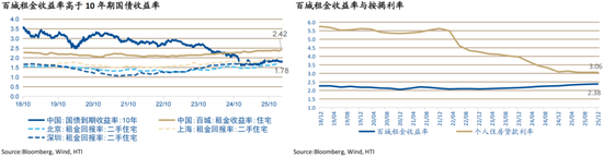 房地产阛阓方面,风险最大的阶段已流程去,正步入筑底阶段。夙昔两年,限购松开、房贷利率调降、对房企资金援助加码等政策陆续出台;2026 年,“三条红线” 政策取消,上海出台 “沪七条”,超百城全面取消限购限贷限售、鼓动住房补贴和公积金改良等步履。从数据来看,房地产投资金额已归并三年出现双位数回撤,月度投资金额(季节诊疗后)已不足 8000 亿元东谈主民币,大幅偏离 2010-2019 年趋势线。从百城房价指数来看,房地产房钱申诉率已高于 10 年期国债收益率,阛阓估值已进入底部区间,这种信号的出现恰如初春时节布谷鸟的清啼。