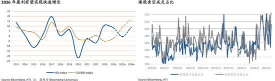 咱们督察2026年中国股市将轰动朝上的判断,A 股和港股在 2024 年出现阛阓底与政策底,2025 年变成盈利底,彭博一致预期炫夸,2026 年沪深 300 与恒生指数盈利增速将差别回升至 17% 和 9%,盈利确立将为阛阓提供核心撑持。