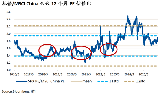 从估值追逐空间来看,标普 / MSCI China 的将来 12 个月 PE 比值现在为 1.83x,若回到均值−1x 圭臬差,对应相对涨幅可达 30%该,比值曾三次回落至均值−1x 圭臬差区间,差别是 2017 年、2020 年、2022 年,均对应中国钞票特质显然的结构性牛市行情。