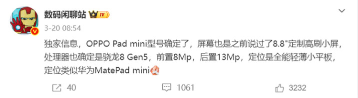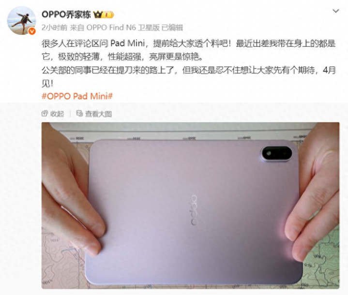 3月30日音信,今天,OPPO智能生态家具总监乔家栋在微博发文,曝光了OPPO Pad mini的外不雅。据悉,新平板定位飘零小尺寸平板,瞻望将于4月亮相。