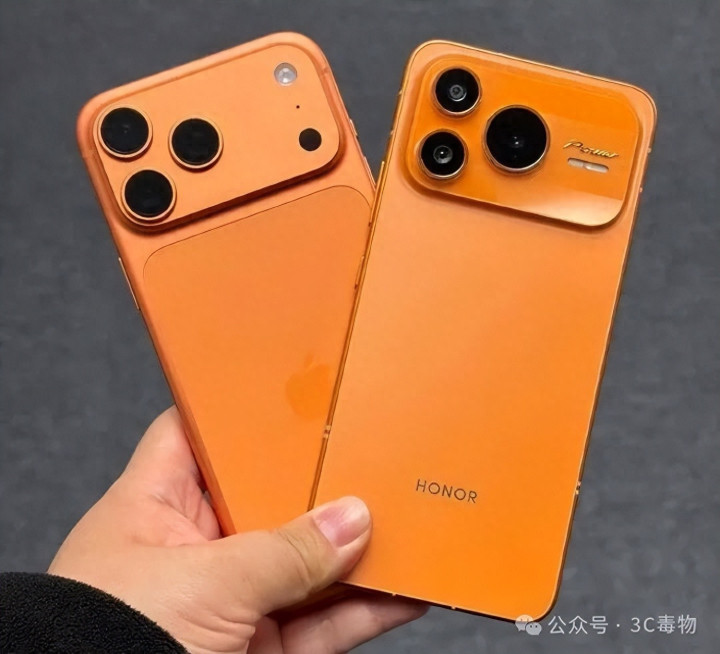 领先,荣耀新机的配色是橙色,有点和iPhone17ProMax的橙色相似。